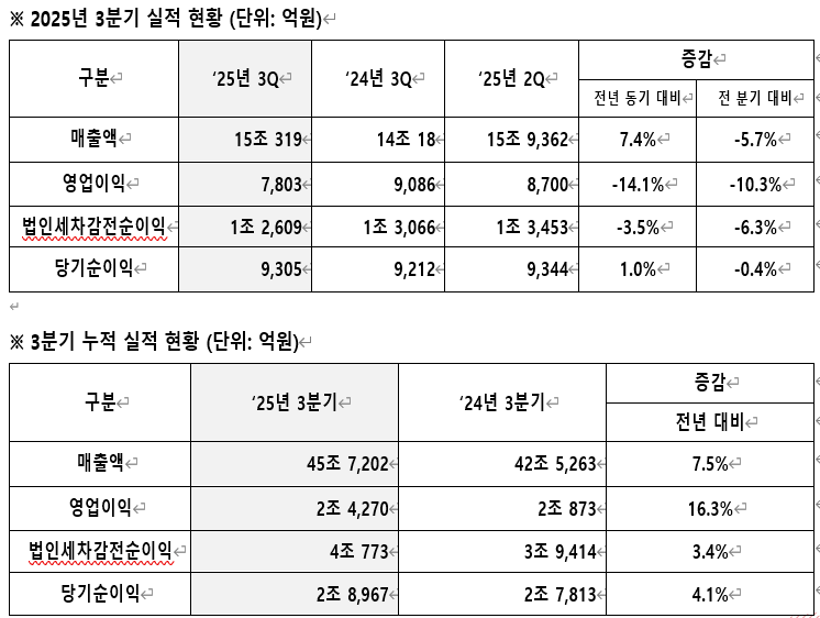 - 올 3분기 매출액 15조 319억원, 영업이익 7,803억원… 전년 동기 대비 각각 7.4%↑, 14.1%↓